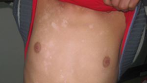 3、白斑会因为周围有色素沉着而易与正常的皮肤进行区分。另外,胸部白癜风患者的患处皮肤对于阳光的敏感度会提升,只要稍微接受太阳照射,皮肤就会有变红的症状表现,更有甚者会出现水疱等。
